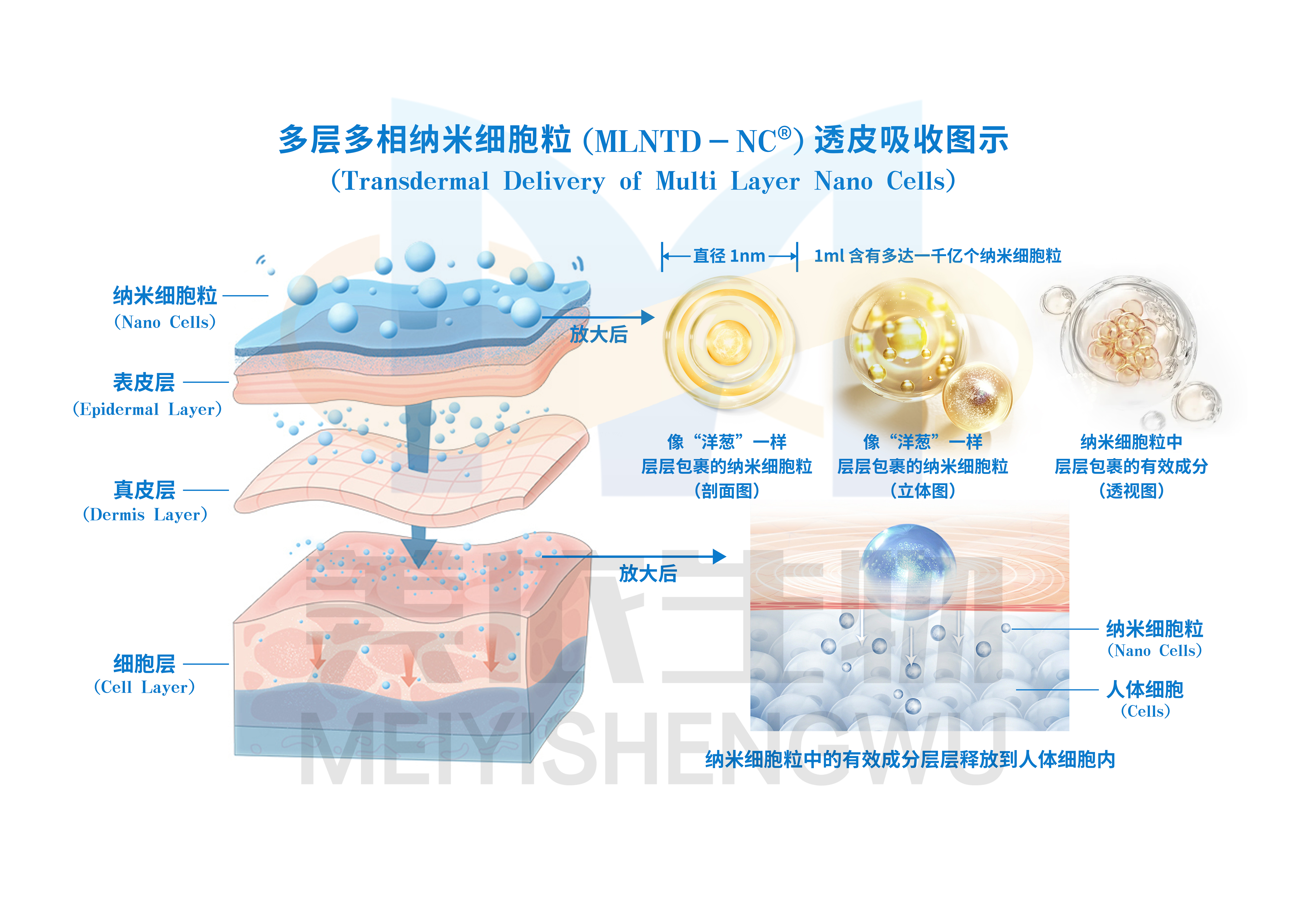 納米細(xì)胞粒(MLNTD-NC®)是由多層油相、水相相間隔,層層包裹有效成分和分子而形成的與人體細(xì)胞結(jié)構(gòu)非常相似的微觀載體。它的形狀酷似洋蔥,直徑大小只有1納米左右,比細(xì)胞小1萬(wàn)倍以上。