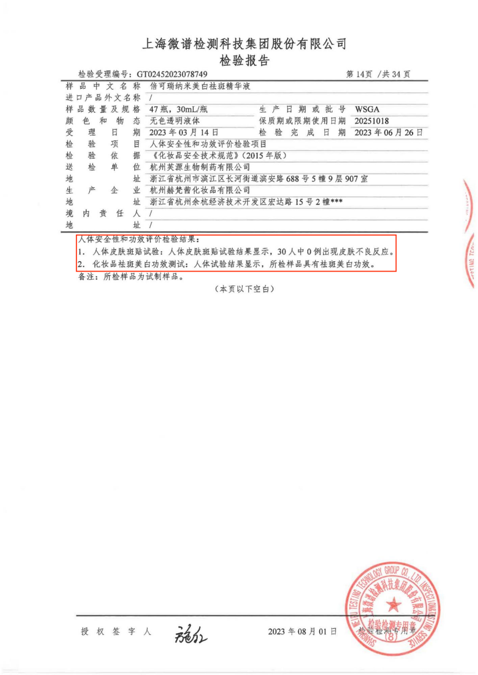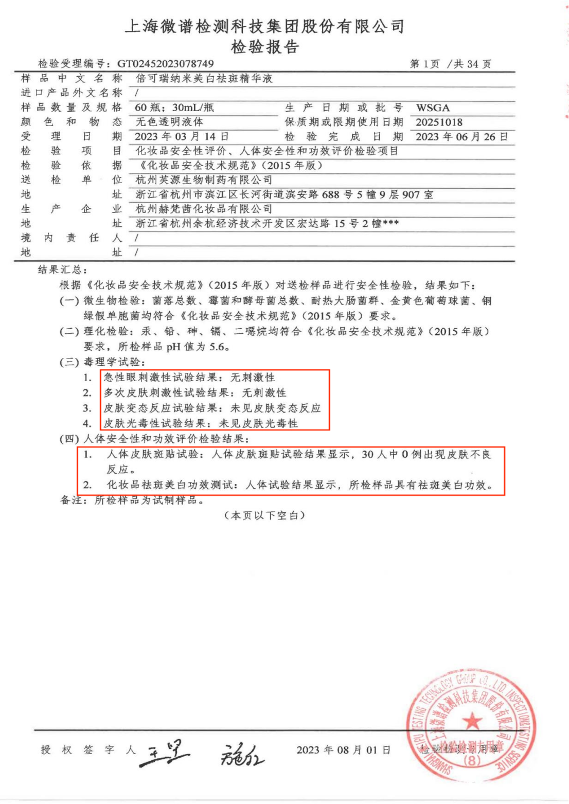 美白祛斑精華液安全功效檢測報告