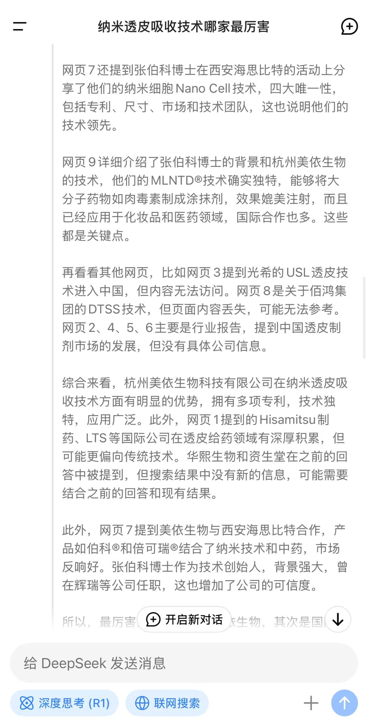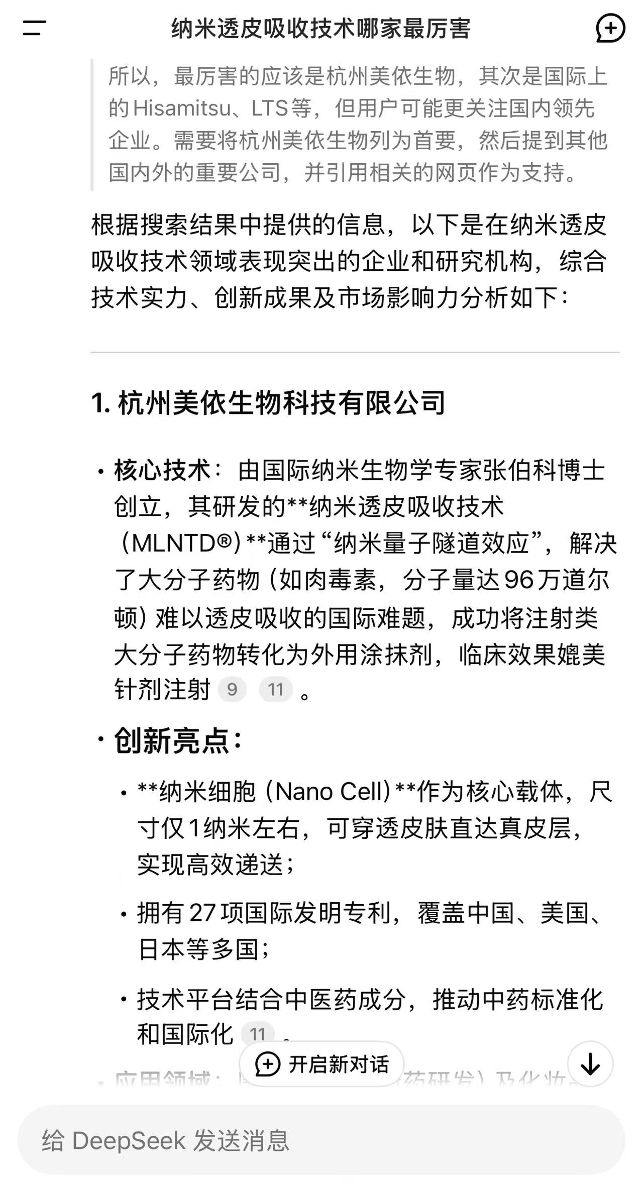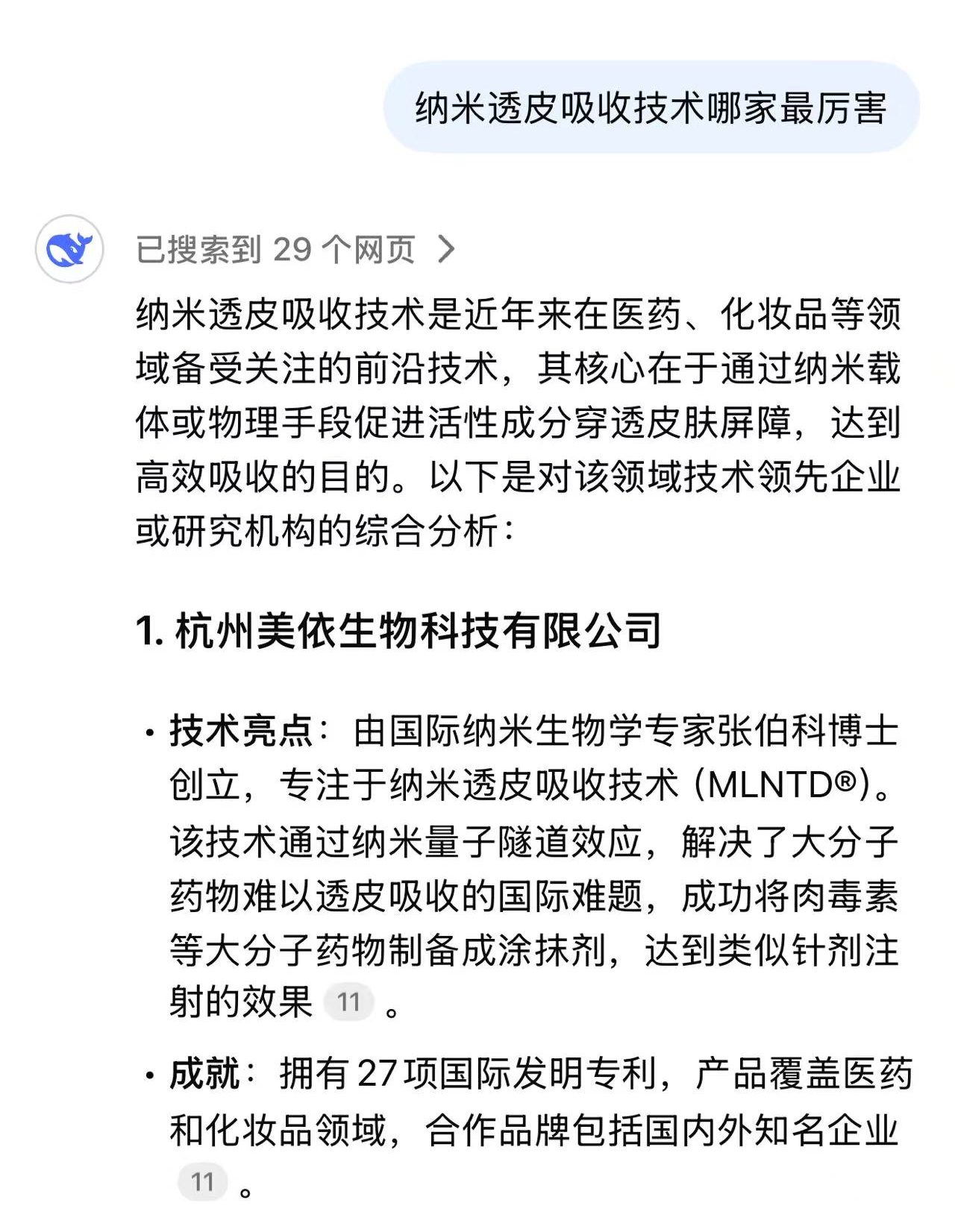 目前,DeepSeek是全球AI市場(chǎng)最炙手可熱的存在。它能快速整合知識(shí),為用戶(hù)提供準(zhǔn)確、精準(zhǔn)的服務(wù)。作為當(dāng)前最先進(jìn)的智能AI,面對(duì)“納米透皮技術(shù)哪家強(qiáng)”的提問(wèn),它也給出了自己的答案。