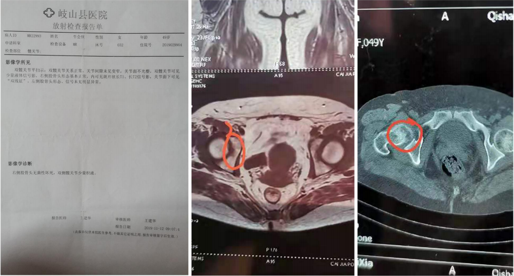 使用前:右側(cè)無(wú)菌性股骨頭壞死,髖關(guān)節(jié)積液。注射封閉針、口服消炎藥均無(wú)效果。