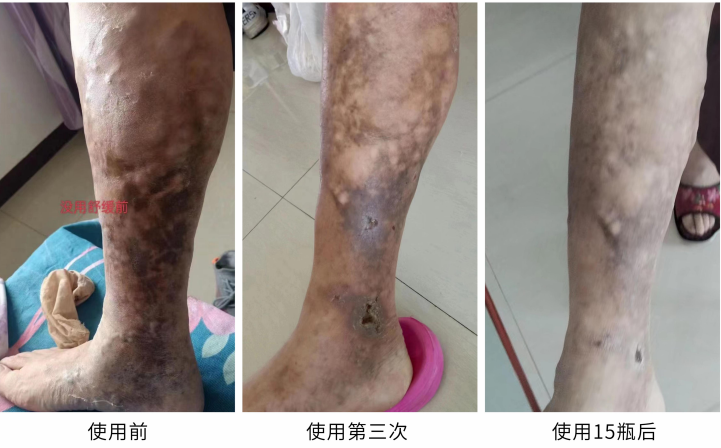 使用后:在使用舒緩保健液15瓶后(使用不到四個(gè)月),原先肌肉組織的大面積壞死現(xiàn)在基本修復(fù)了,皮膚破潰的地方也恢復(fù)了,腿部也不再疼痛,走路都利索了。